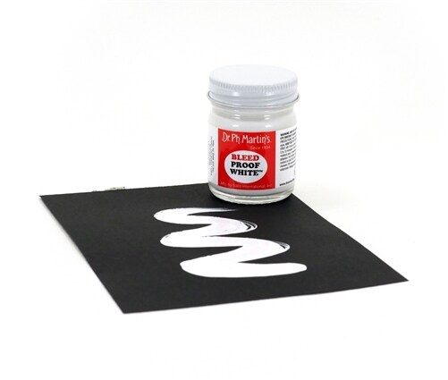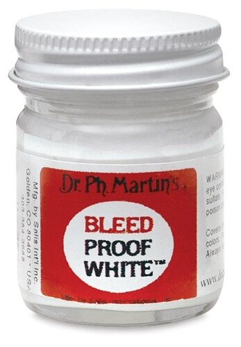 Dr. Ph. Martin's Bleedproof White is an opaque watercolor for covering dye colors, markers, and designer colors. It is not intended for mixing. Comes in a 1.0 oz (30 ml) glass jar.